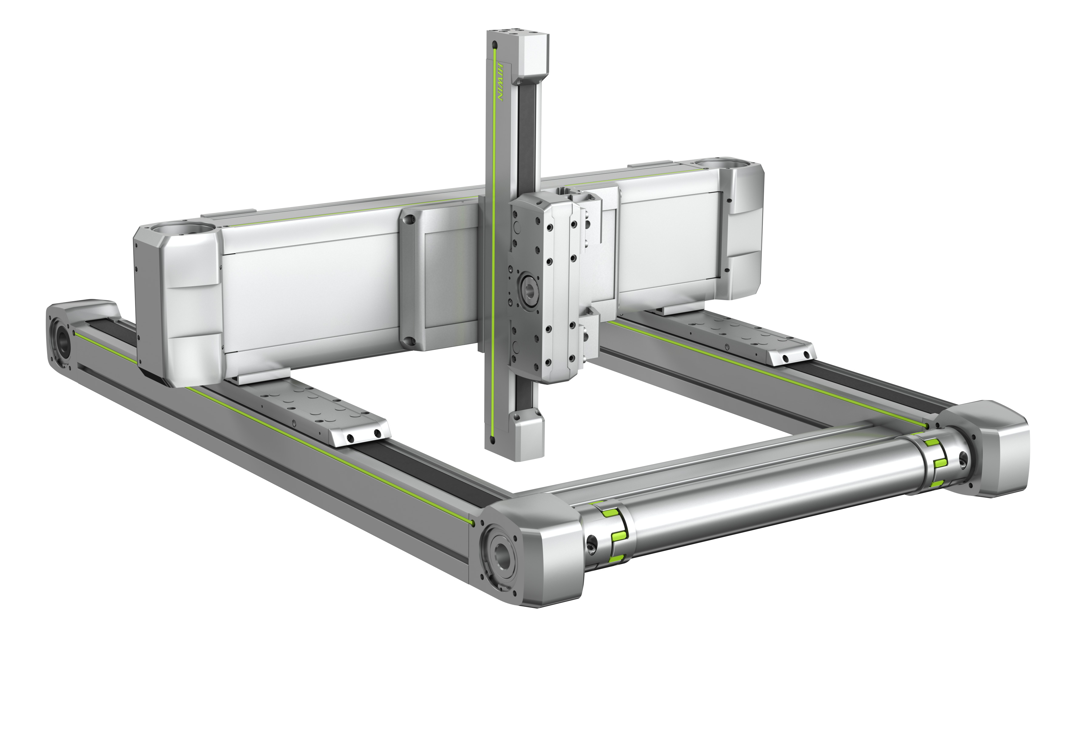 These three-axis systems are based on a HIWIN HD double axis in X direction. This guarantees both quick and precise positioning. A linear table from the HT-B series is built into the Y-axis. Thanks to the integrated double guides, it can absorb high levels of torque and is exceptionally rigid. The HC cantilever axis with Omega belt drive and a particularly lightweight yet rigid cantilever ensures dynamic movements in Z direction.