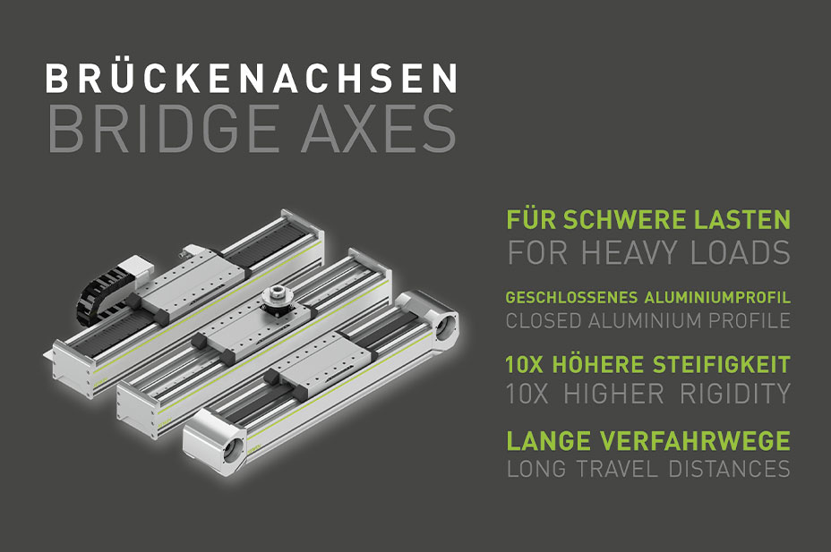 Longer, heavier, stronger: thanks to their closed aluminium profile, bridge axes are particularly resistant to torsion and bending and are sized for maximum moment loads. Depending on the application requirements, we manufacture the heavy-duty axes in Offenburg with either a toothed belt, linear motor or rack and pinion drive. With travel speeds of up to 5 m/s and load capacities of 350 kg handling weight, the bridge axes achieve repeatability of up to ± 0.005 mm.
