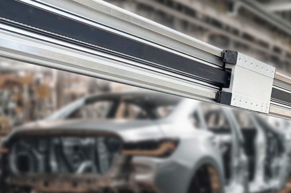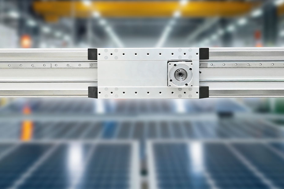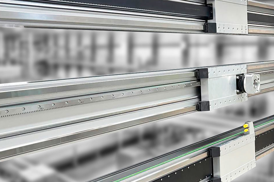 A toothed belt drive enables high speeds over a long travel distance, as required for fast handling and positioning tasks, for example. Linear motor drives are particularly suitable for applications in which high accelerations and speeds are to be combined with high precision and minimal maintenance effort at the same time. And if the highest payloads at maximum speed over almost unlimited strokes are required, as is the case with large gantries, for example, we also offer our bridge axes with​​​​​​​ rack and pinion drive. The drive design is particularly suitable for harsh environmental conditions, as often found in demanding heavy-duty applications. The drive enables comparatively good positioning accuracy, high efficiency and achieves travel speeds of up to 5 m/s. A servo motor is used to initiate a rotational movement directly at the guide carriage by means of a gearbox, thus achieving direct power transmission. An oil-soaked felt wheel built into the slide continuously supplies the rack with the necessary lubrication during operation, depending on the lubrication system.