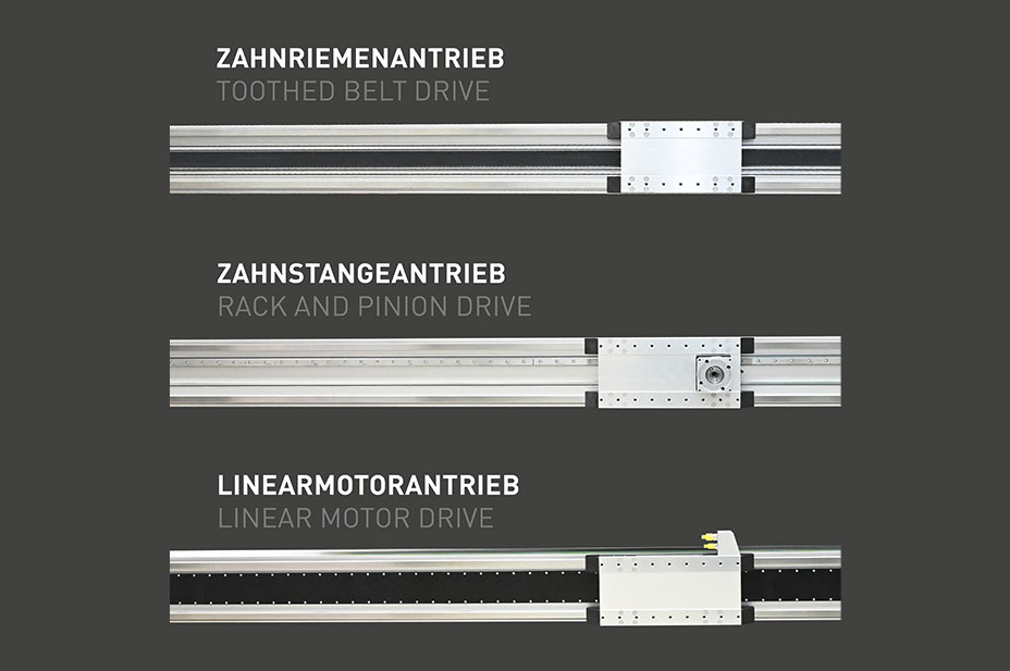 Modular linear axes and linear axis systems allow for easy integration into a wide range of applications. Requirements for payloads, precision and environmental resistance are constantly increasing. Depending on the area of application, the type of drive plays an important role. We therefore offer our dynamic heavy-duty axes with a closed aluminium profile in three different drive types.