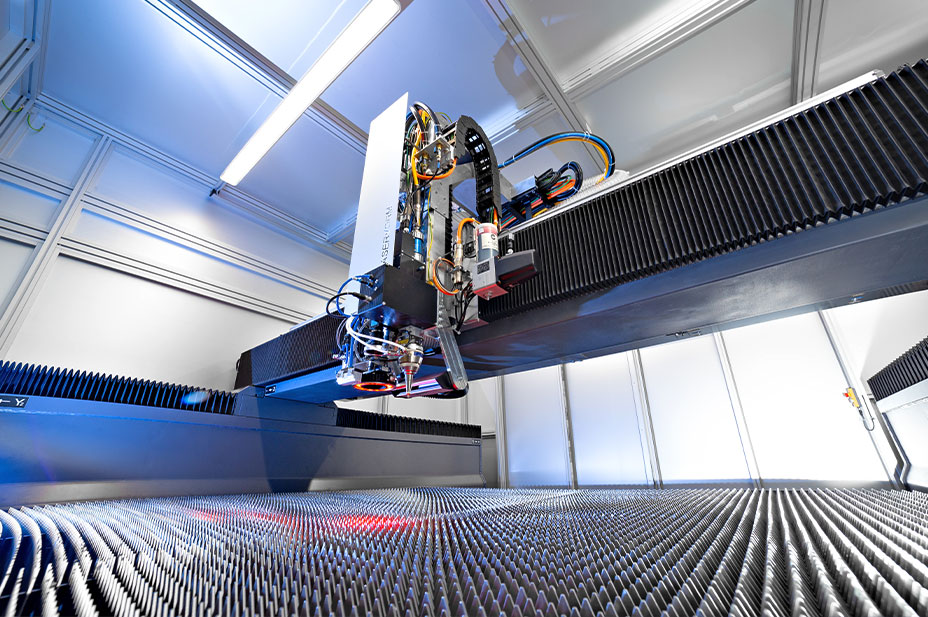 The gantry system is made up of an X-axis, two parallel synchronized Y-axes and a Z-axis. The portal beam in steel construction is manufactured in a complex and rigid sheet metal construction to ensure the high dynamic response that is essential for this application.