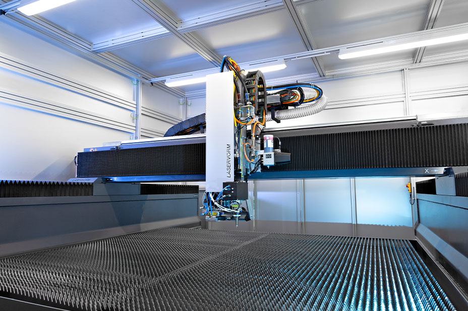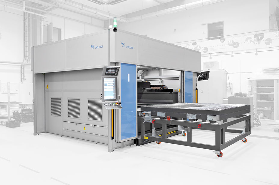 The biggest challenge was combining the two processes in a single machine and in a working area of two by two meters. The solution: a combined laser welding and cutting system in a gantry design with a pallet changing system. Chain drives with cams and outriggers ensure that the pallet tables are moved alternately from the outside into the machine and back.